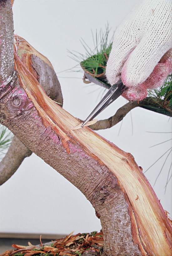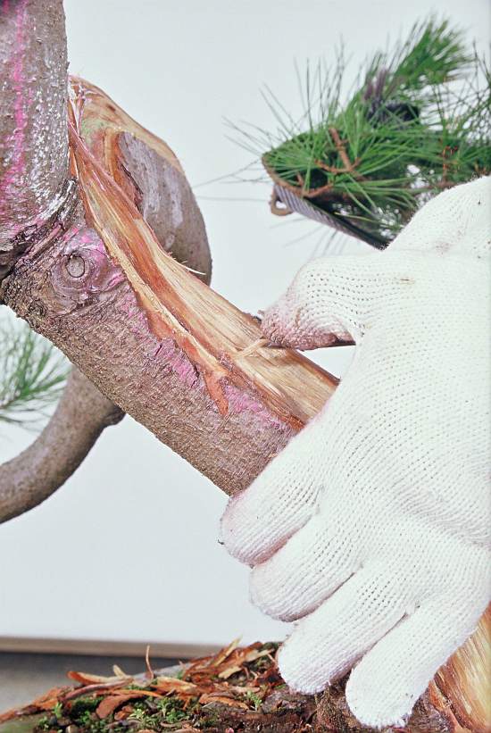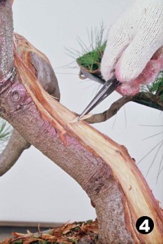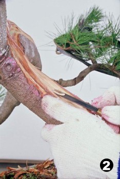 [安全使用方法] 直推刀的作用是向前推, 然後挑起材絲,再以手輔助拉起材絲,或用尖嘴鉗夾起材絲,完成絲雕動作。 使用直推刀時,如圖7所示,刀鋒向前角度90°內,該範圍是危險區域,輔助拉起材絲的另一手,在刀鋒尚未深入木材定止時,不可留置於刀鋒前,以確保安全。待刀鋒定止時,另一手方可按壓材絲,輔助拉起,或以尖嘴鉗夾起材絲,完成挑絲動作,使用步驟如圖7∼10所示。